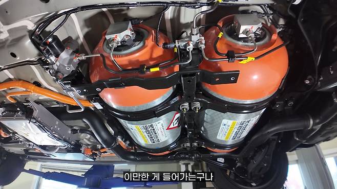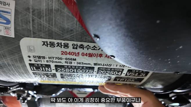 신형 넥쏘는 하체를 보면 정말이지 놀라움을 금할 길이 없습니다. 눈앞에 펼쳐진 거대한 부품들은 그 크기만으로도 엄청난 존재감을 드러내죠. 이곳저곳에 붙어 있는 택과 글씨, 그리고 검사필 및 불 화기 표시 등을 보노라면 이것이 단순히 일반적인 부품이 아님을 직감할 수 있습니다. 모르는 사람이 보더라도 얼마나 중요한 부품인지 단번에 알아차릴 수 있을 정도입니다.