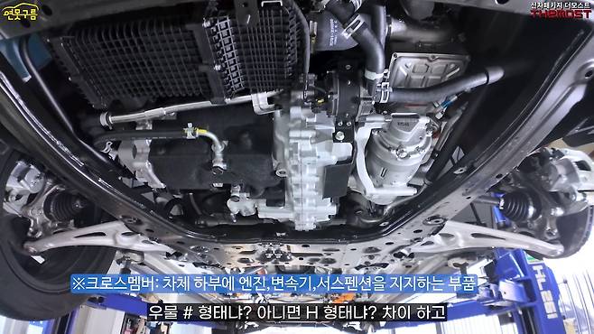 일반적으로 3세대 플랫폼을 이야기할 때 주로 하부의 우물 정(#)자 프레임을 기준으로 삼곤 했습니다. 하지만 조향 장치, 특히 서스펜션에도 이러한 중요한 차이가 있다는 점은 흥미롭습니다. 그리고 3세대 플랫폼임에도 불구하고 신형 넥쏘는 스태빌라이저나 스태빌라이저 링크가 부착되는 방향이 다른 3세대 플랫폼 차량들과는 미묘하게 다릅니다. 이는 신형 넥쏘만의 독특한 특징이라고 할 수 있습니다.