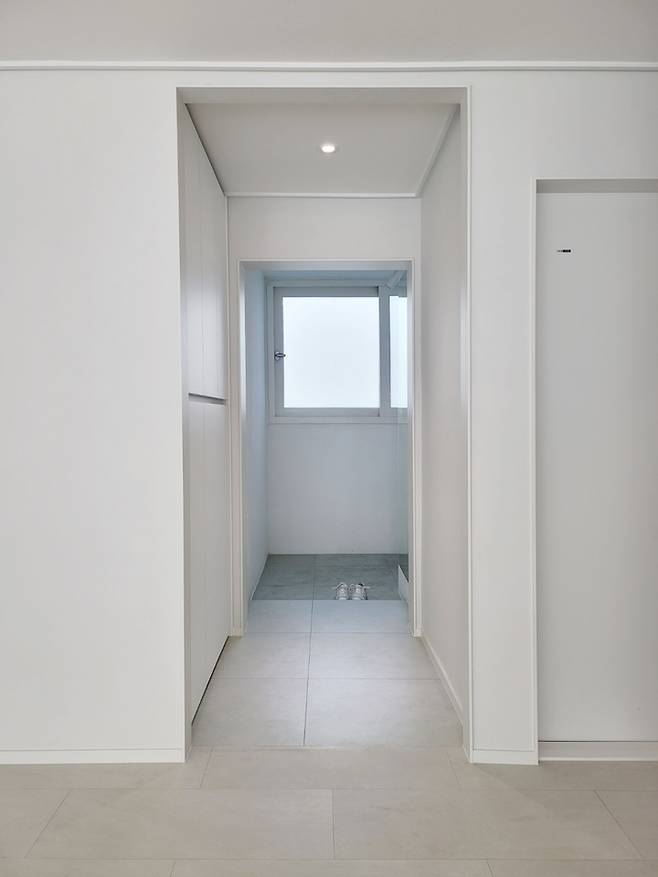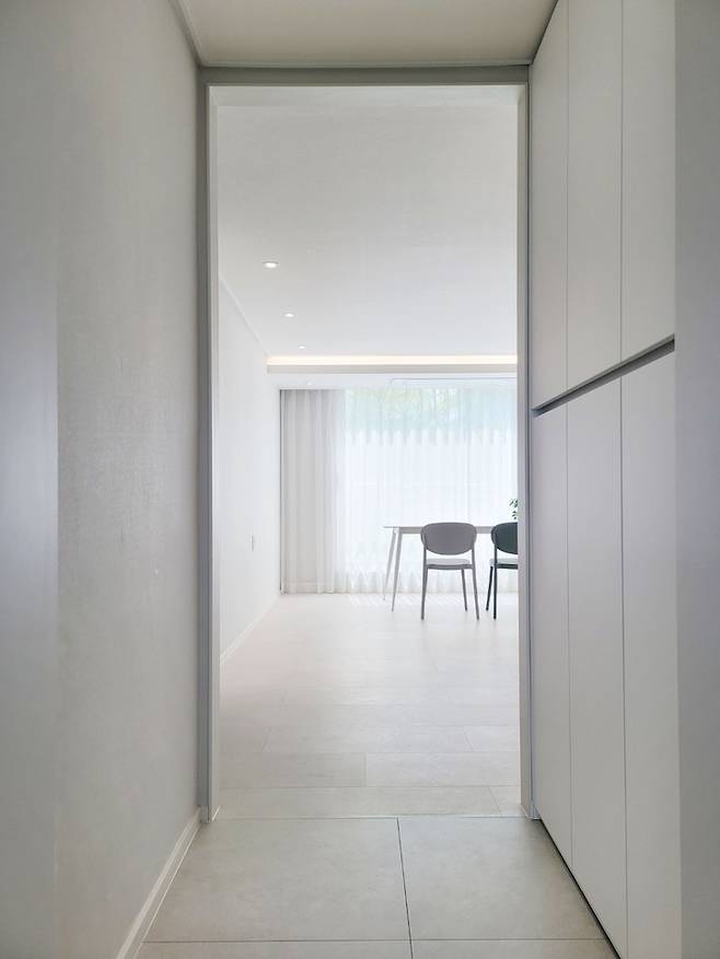 거실에서 보이는 전실 모습입니다!! 과감하게 방화문을 철거했고 탁 트인 느낌을 주려고 인방을 최소화했어요. 9mm 문선으로 보다 확장된 느낌이 들게 했어요.