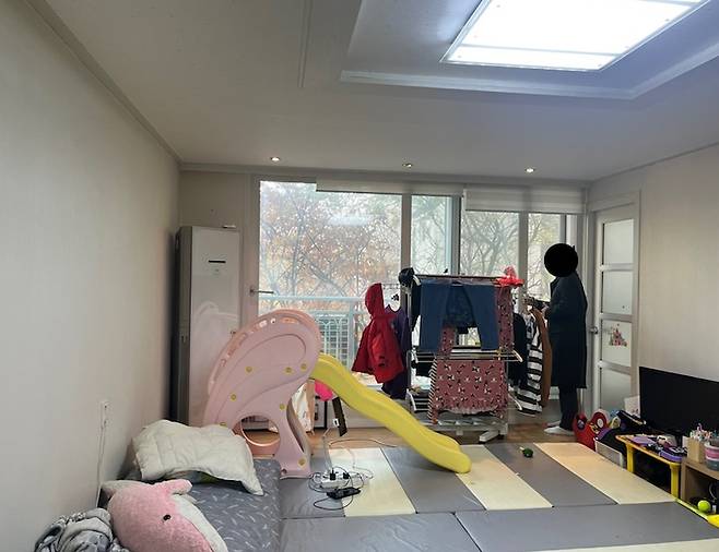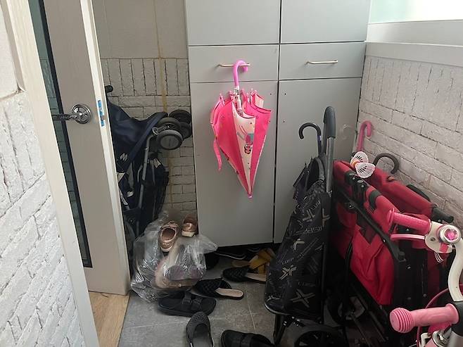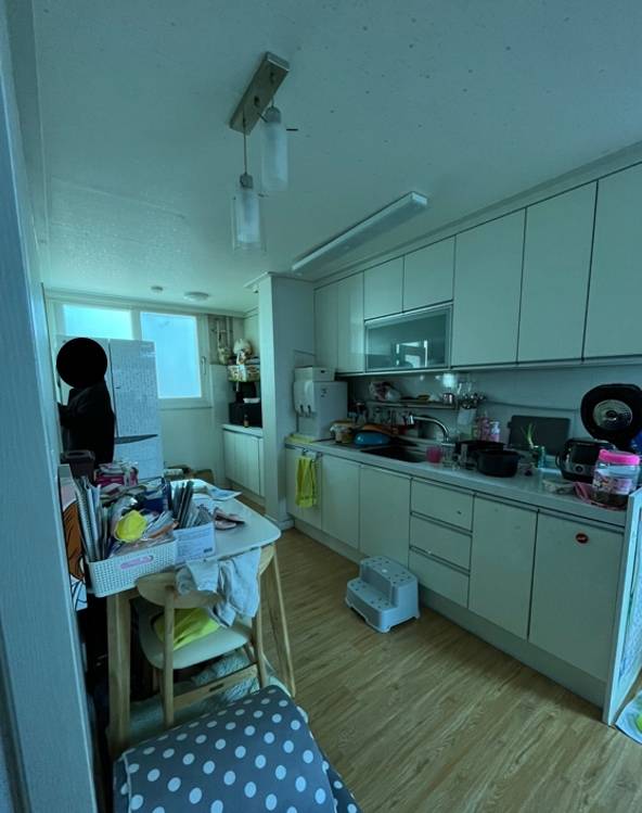 전실은 집의 첫 이미지인데, 툭 나와있는 신발장, 유모차 때문에 갑갑한 느낌이 들었고 굉장히 두꺼운 방화문이 더더욱 공간을 좁게 느껴지게 했어요. 이전에 거주하던 분이 아이와 강아지를 키우셨던 데다 이사도 준비 중이셔서 짐이 정말 정말 정말 많았습니다.