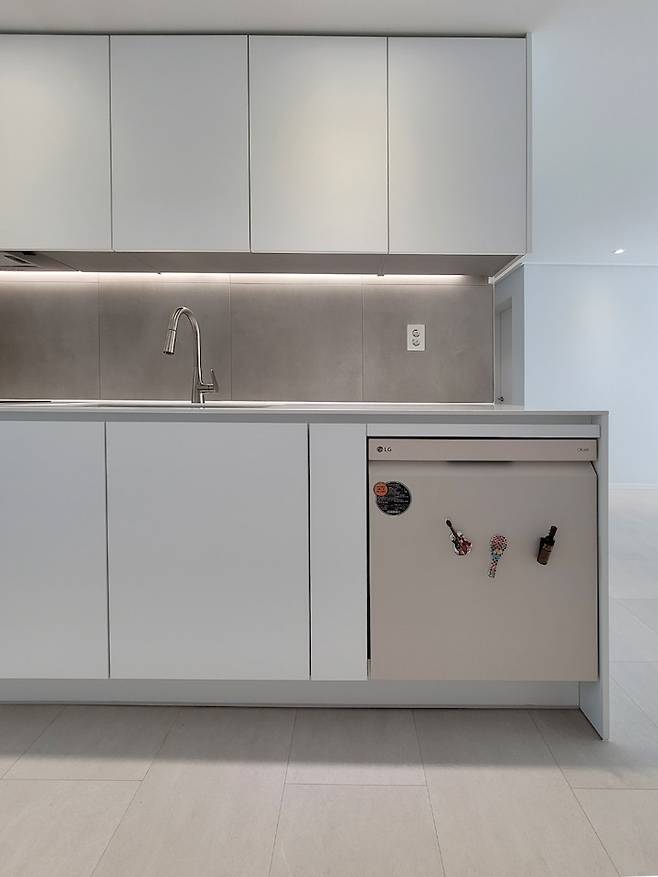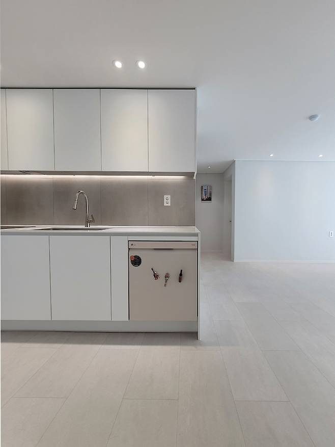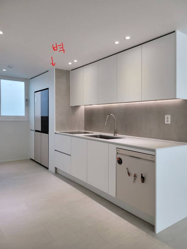서라운드 없이 무광 PET 화이트로 제작하였고 LG가전 빌트인 가구에 맞게 싱크대 제작하였습니다. 빌트인 가구의 라인 정리 레퍼런스를 많이 못 찾아서.. 직접 수치를 재고 요리조리 시뮬레이션 끝에 결정한 레이아웃입니다. 디자인하실 때 작은 도움 됐으면 좋겠습니다! 라인이 잘 맞나요..? :)
