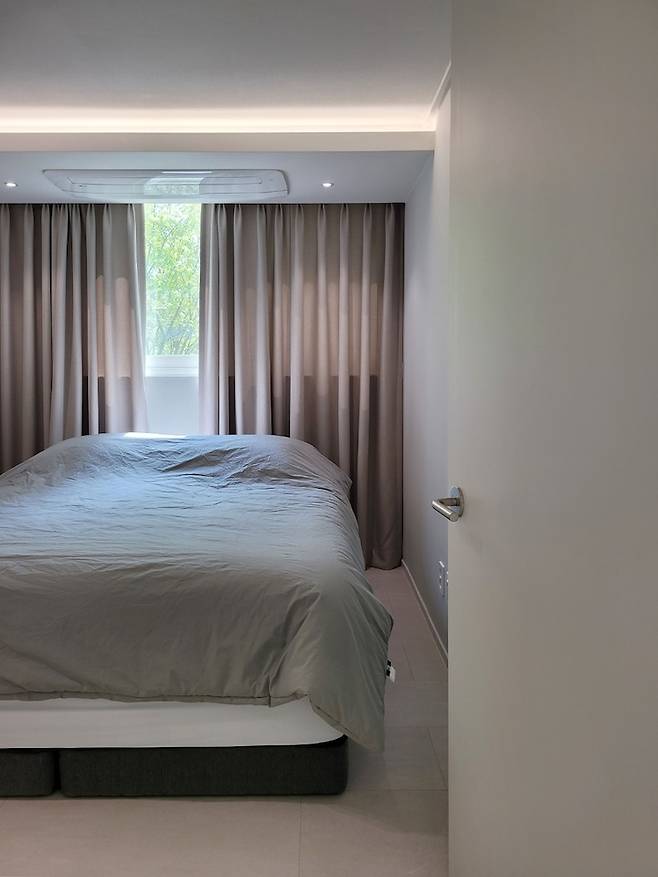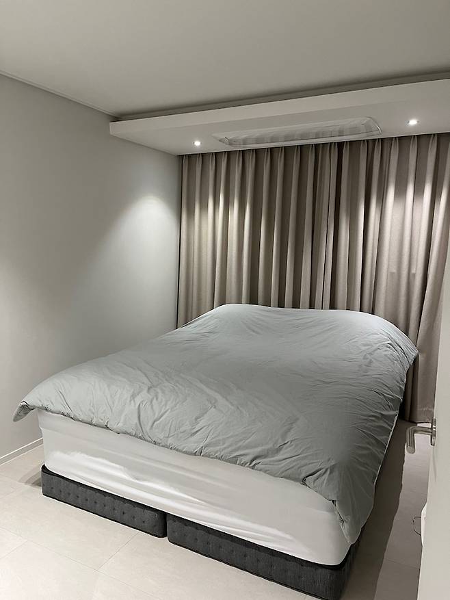 짜잔~! 침실입니다. 역시 거실과 마찬가지로 시스템에어컨 자리에 T5 간접조명을 설치하여 은은하고 분위기 있는 침실을 만들려고 했습니다~ 수면하는 공간인 만큼 오로지 커튼, 침대, 에어컨으로만 꾸몄어요.