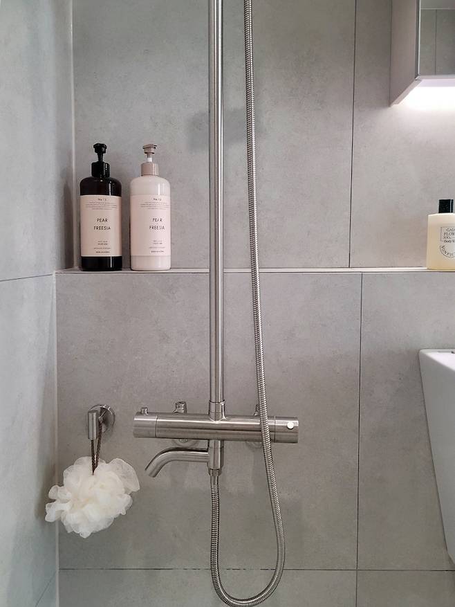 수전은 무광으로 통일했고, 도기는 모두 아메리칸 스탠다드 기본형으로 선택했습니다. 무드에 맞게 샴푸, 바디워시도 조화롭게 꾸며봤습니다.