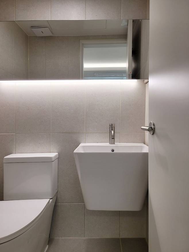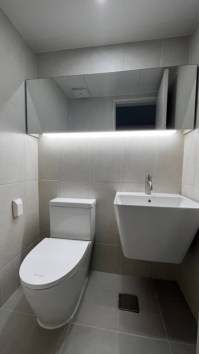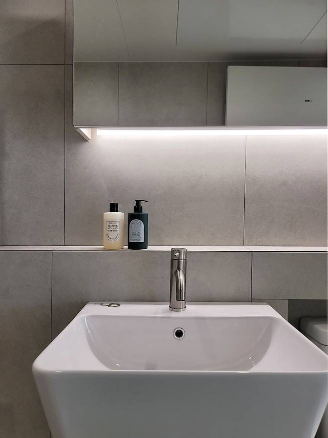 공용 욕실과 똑같이 플랩장 T5 매립에 벽에서 벽 끝까지 구분선 없이 거울을 제작해 시원하고 넓어 보이는 느낌을 주려고 했습니다. 자세히 보시면 귀여운 테라조 타일인데 사진에는 잘 안 보이네요 :)