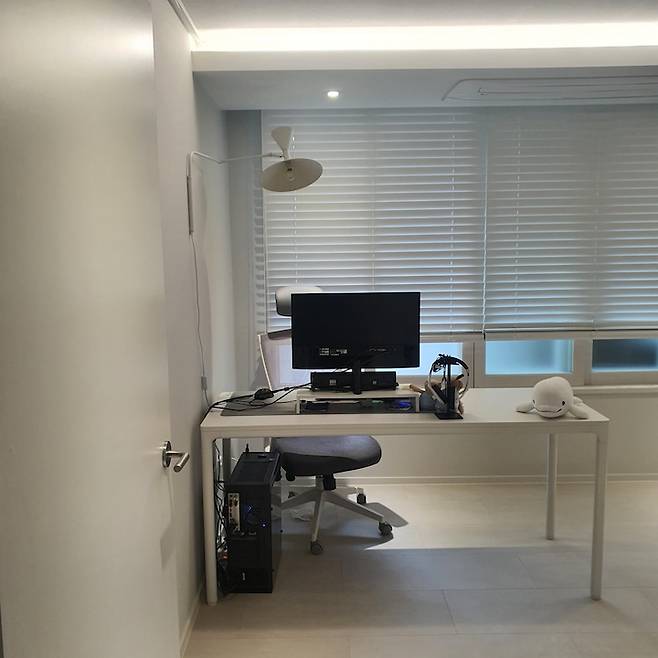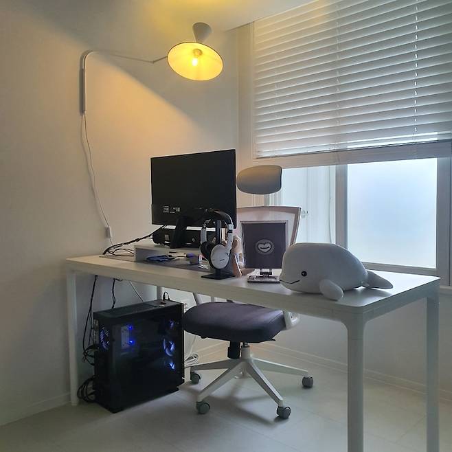 컴퓨터와 포인트 벽조명, 최애 오브제 벨루가 인형까지! 오픈 형태라 컴퓨터 선 등이 조금 신경 쓰이긴 했지만 케이블타이로 잘 마무리하니 크게 지저분한 느낌은 들지 않았어요!