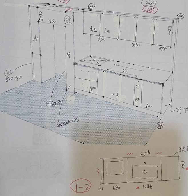 조금 더 자세히 보시면, 상부장은 간격을 일정하게 맞췄고 하부장은 좀 더 많은 수납과 편리한 기능을 위하여 서랍 및 망장 등을 계획했습니다. 인덕션을 위한 전용 콘센트도 하나 추가해서 사용에 큰 무리가 없도록 하였습니다. 계획과 비슷하게 잘 나온 것 같나요? (지벤디자인 턴키 사장님.. 최고..b)