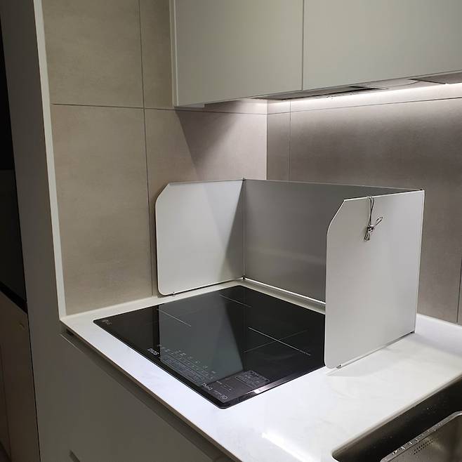 조리대가 부족하다 보니 옆 타일, 수전 등에 기름 등이 튈까봐 레인지가드도 너무 잘 활용하고 있고요.