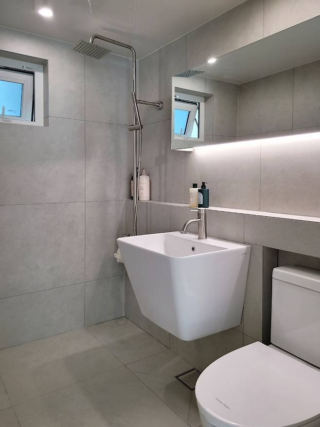 공간이 협소하여 파티션은 설치하지 못했어요. 그래도 벽면 끝부분부터 샤워 부스까지 끊어지지 않게 연결하여 넓은 느낌을 주려고 했어요. 전체적인 집 분위기에 살짝 톤 다운된 그레이 톤으로 정돈된 느낌을 주려고 했고요. 역시 가장 많이 쓰는 화장실에 젠다이는 꼭 하면 좋은 것 같아요!