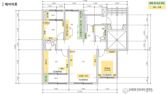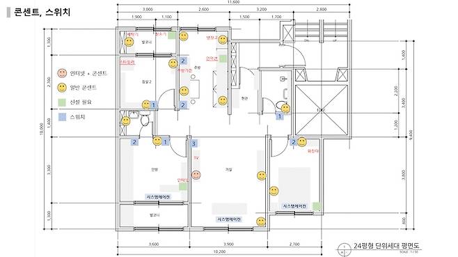 24평에 방 3개, 화장실 2개인 구축 아파트 평면도입니다. 평면도는 일반 24평형 아파트와 크게 다르지 않지만 저희의 라이프스타일과 집 구조의 단점을 고려해 기존 형태에서 몇 가지 변화를 시도했어요.