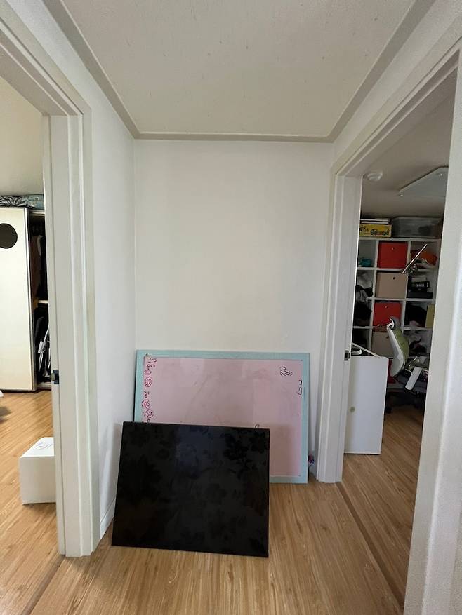 몰딩이 굉장히 크고 벽면이 인접한 부분 색이 일치하지 않아 어수선한 느낌이 들었어요. 전체적으로 9mm 문선 시공을 통해 통일된 느낌을 주기로 계획했습니다. 좋았던 점은 넓은 벽면 덕분에 액자를 걸면 이쁘겠다! 생각했어요.