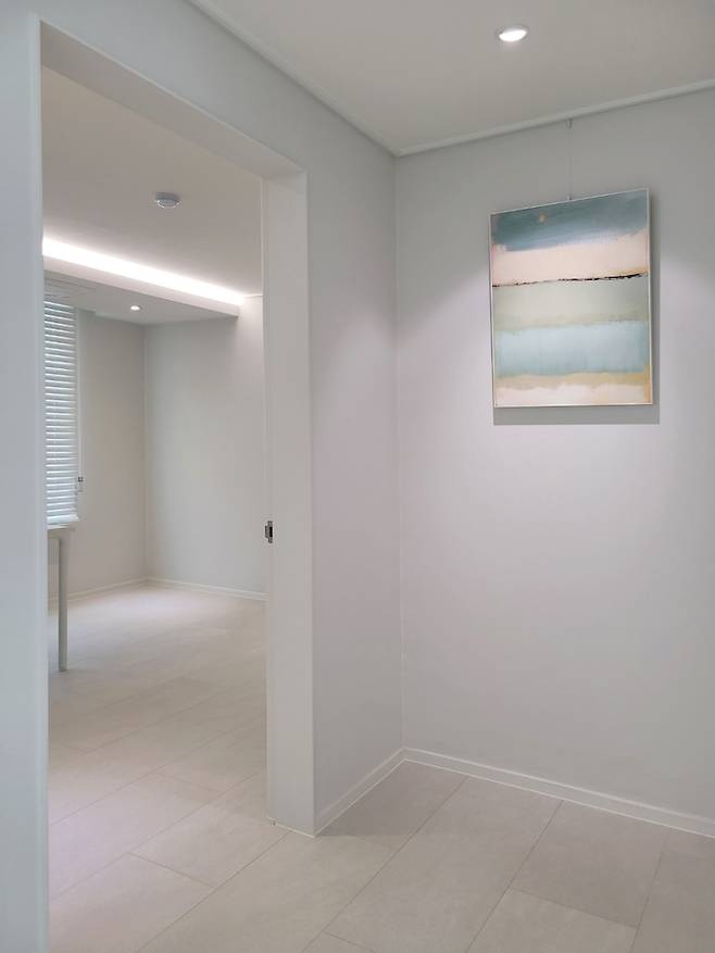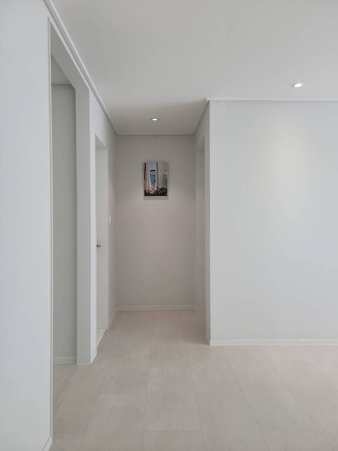 집으로 들어와 왼쪽으로 틀면 보이는 복도입니다. 그림은 집들이 선물로 받은 앨리스달튼 액자입니다! 공간에 비해 약간 작은 느낌은 없지 않아 있지만요 :) 자세히 보시면 천장 몰딩을 마이너스 몰딩 시공했습니다. 실제로 보면 9mm 문선과 함께 깔끔하고 간결한 느낌을 줍니다.