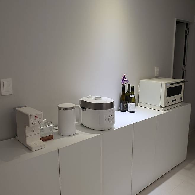 부족한 수납을 보완하기 위하여 반대편은 낮은 수납장을 구매해서 홈바처럼 쓰고 있어요. 일리 커피머신, 발뮤다 오븐, 밥솥 모두 화이트 & 아이보리 계열로 통일해서 일체감을 주려고 했습니다.