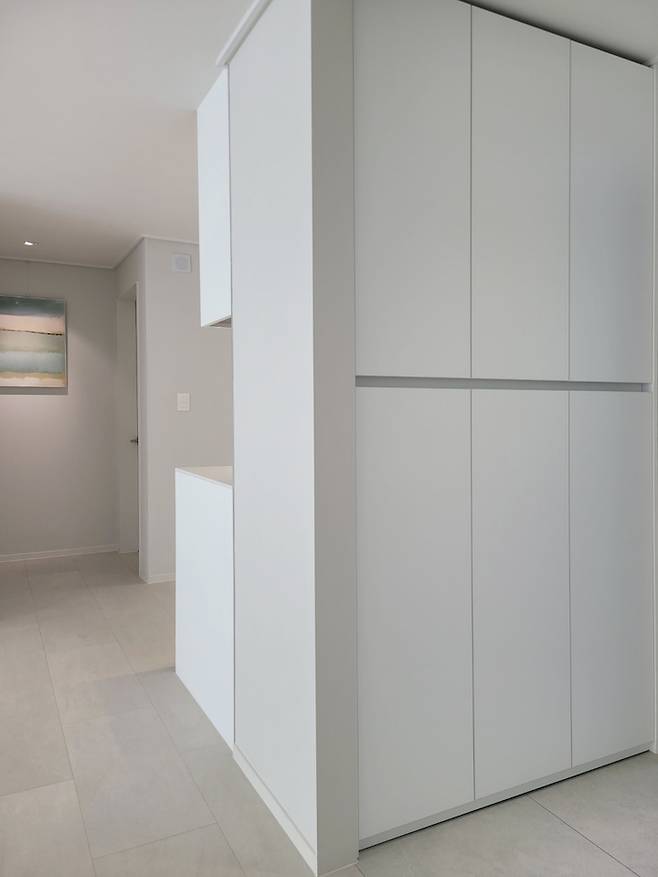 중문..은 정말 달아야 하나 말아야 하나 고민이 많았는데 전실이 넓기도 하고 비용도 꽤 부담이 되더라고요. 그래서 언제든지 중문 시공을 할 수 있도록 신발장 옆에 공간은 만들어 두고 오픈 게이트로 시공 마무리하였습니다.