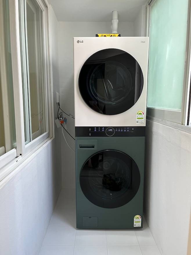탄성 코트 도장 진행 후, 워시타워를 설치한 모습입니다. 키가 작아 상부장은 의미가 없어서 현재는 세탁기 좌측에 세제 담을 수 있는 선반만 추가했어요! 워시타워 자체가 인테리어의 완성인 느낌의 세탁실 입니다 :)