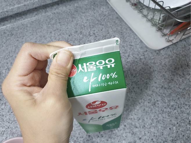 그리고 개봉한 우유는 이렇게 입구를 한번 더 눌러서 보관해 주세요