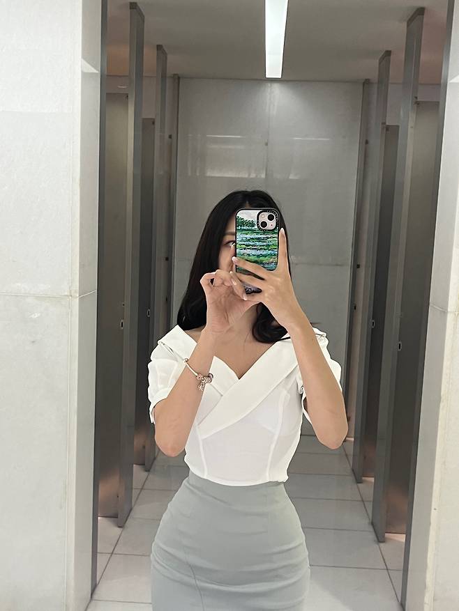 저는 화이트 블라우스와 민트색 미디 스커트를 코디했어요.