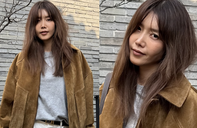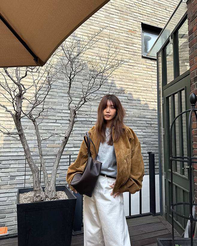 사진 속 채정안은 화이트 팬츠에 카멜색 스웨이드 자켓을 매치해 포근하면서 스타일리시한 봄 패션을 선보였습니다.