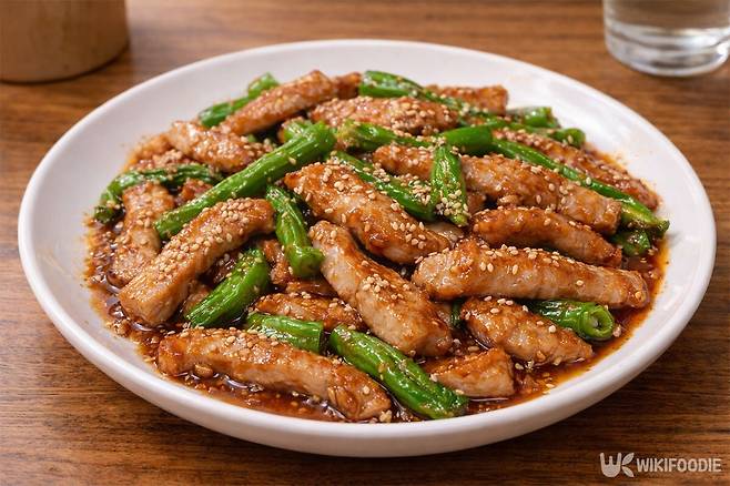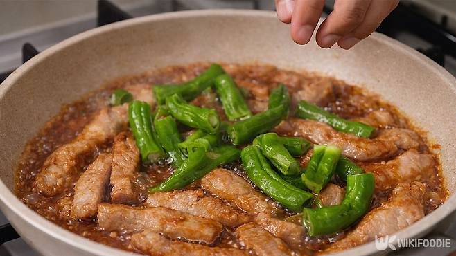 기름을 정리한 팬에 불을 중간 정도로 낮추고 양념장을 붓는다. 고기와 양념이 섞이도록 빠르게 뒤집으며 졸인다. 양념이 걸쭉하게 변했을 때 손질한 고추를 넣는다. 고추를 넣은 뒤에는 아주 짧게 볶아야 한다. 오래 익히면 고추의 색이 변하고 아삭한 맛이 사라지기 때문이다.