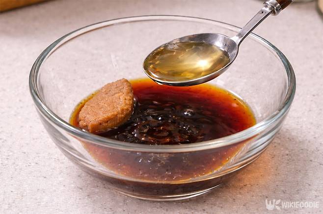 3. 그릇에 물 50ml와 된장, 간장, 맛술, 올리고당, 다진 마늘, 다진 양파, 후춧가루를 넣고 섞는다