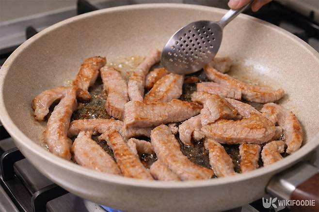 팬을 달군 뒤 항정살 300g을 올린다. 센 불에서 표면을 노릇하게 익혀야 잡냄새를 없앨 수 있다. 고기가 익으며 팬 바닥에 기름이 고이는데, 이때 팬을 기울여 키친타월로 기름을 닦아낸다. 기름을 닦아내는 과정이 있어야 나중에 넣는 된장 양념이 고기 겉면에 층을 이루며 잘 입혀진다.