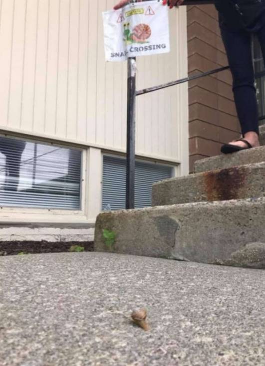 그녀는 곧 행동에 나섰습니다. 달팽이의 이동 경로에 작고 귀여운 안내 표지판을 설치한 것인데요. ‘주의! 달팽이가 지나가고 있어요’라는 메시지가 적힌 표지판에는 귀여운 달팽이 일러스트도 함께 들어 있었습니다.
