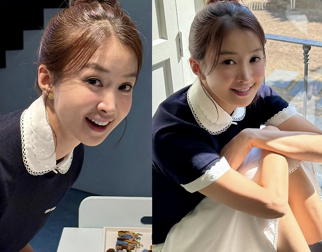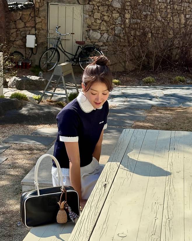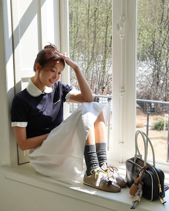 사진 속 이시영은 러블리한 레이스 카라 포인트 상의와 화이트 스커트를 입고 스니커즈를 매치해 발랄하면서 러블리한 패션을 완성했습니다.