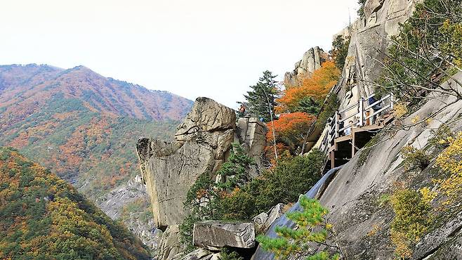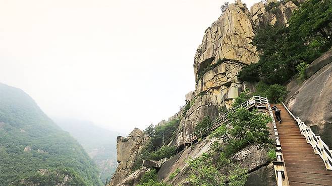 두타산의 진정한 백미는 해발 470m 지점에 자리한 협곡 마천루다. 깎아지른 절벽 위에 설치된 데크 길을 따라 걷다 보면, 발아래로 펼쳐지는 기암괴석과 폭포, 계곡이 한눈에 내려다보인다.