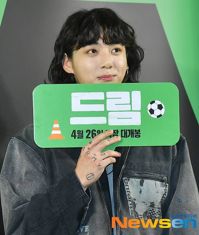 지난 4월 24일 서울 강남구 메가박스 코엑스점에서 영화 '드림' VIP 시사회가 진행됐다. 이날 정국은 박서준을 응원하기 위해 멤버 뷔와 함께 참석했다.