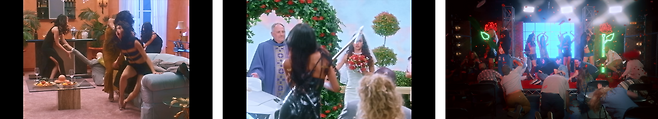 두 번째 선공개 곡 'Gabriela'의 뮤직 비디오는 마치 TV 채널을 돌리는 것처럼, '질투'와 '갈등'과 관련된 스토리들을 다양하게 보여줍니다. 초반부에서는 삼각관계를 다루는 노래 가사를 경영 승계를 다투는 내용으로 전환하면서 이야기가 전개되는데요. 2절부터는 좋아하는 사람을 앞에 두고 그의 사랑을 독차지하기 위해 온갖 수단을 동원하는 모습이 등장합니다. 서로에게 총을 겨누고 뺨을 때리는가 하면, 결혼식 자리에서는 도끼🪓로 내려찍기까지 하며 몸싸움을 이어가죠.