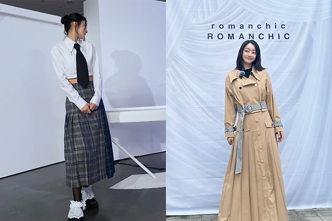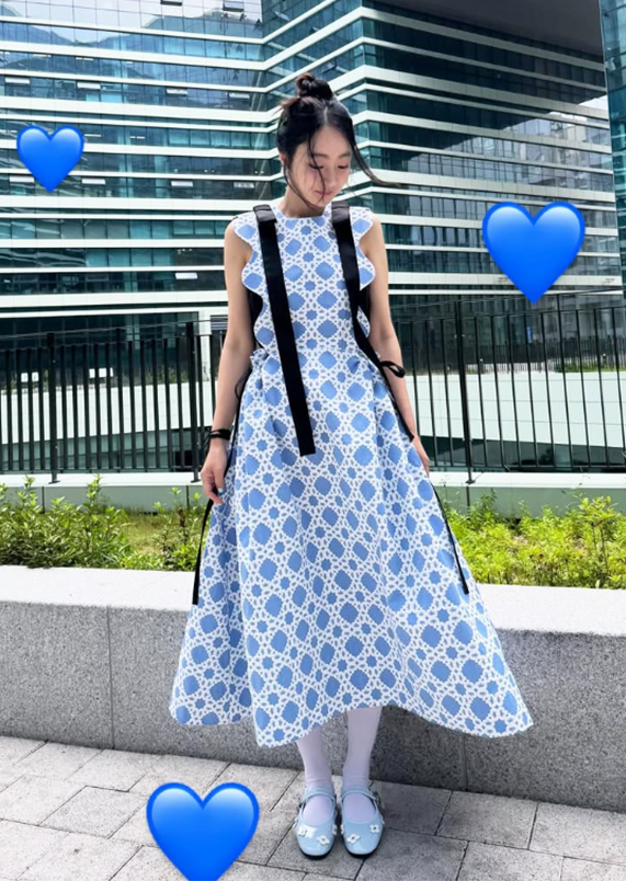 드레스는 전면에 반복된 기하학 패턴으로 시각적인 재미를 더했으며, 소매 라인과 몸통 양옆에 배치된 러플 디테일이 유니크한 실루엣을 완성했다.