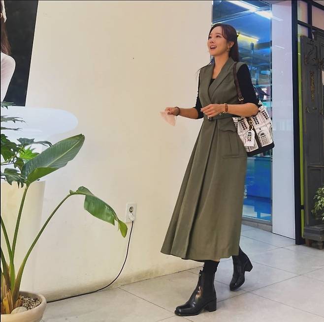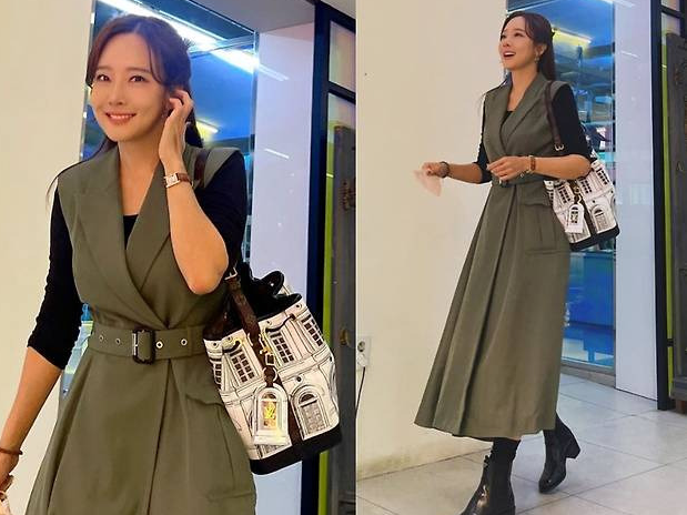 배우 소유진이 세련된 감각이 돋보이는 고급스러운 카키색 원피스 룩으로 눈길을 끌었습니다.
