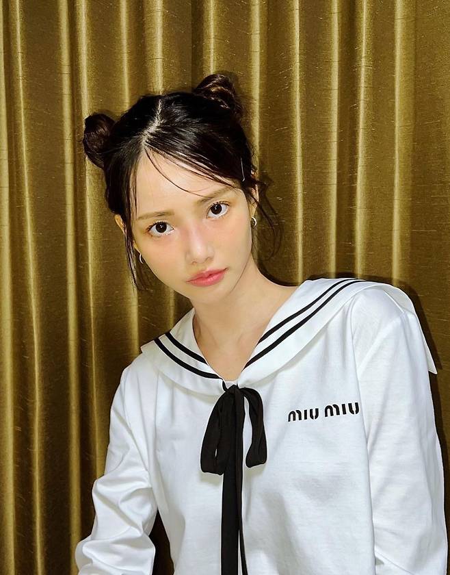 양갈래로 묶는 방법이 정말 여러가지이죠? 당고 모양을 만들어 올린 일명 "뿌까 머리"를 한 모습인데요, 말괄량이처럼 연출한 헤어와 세일러 스타일 상의가 똑 매치된 모습입니다~