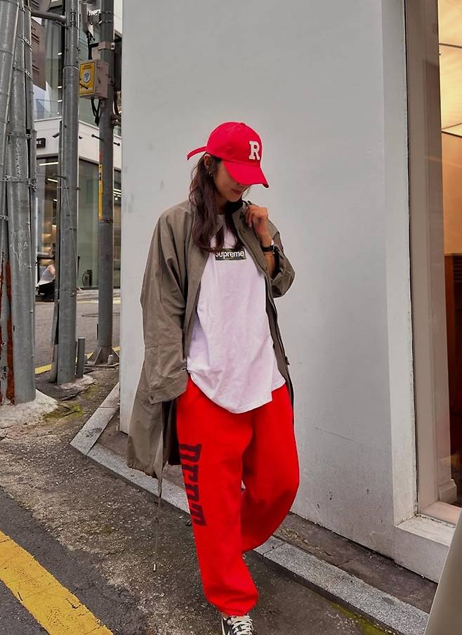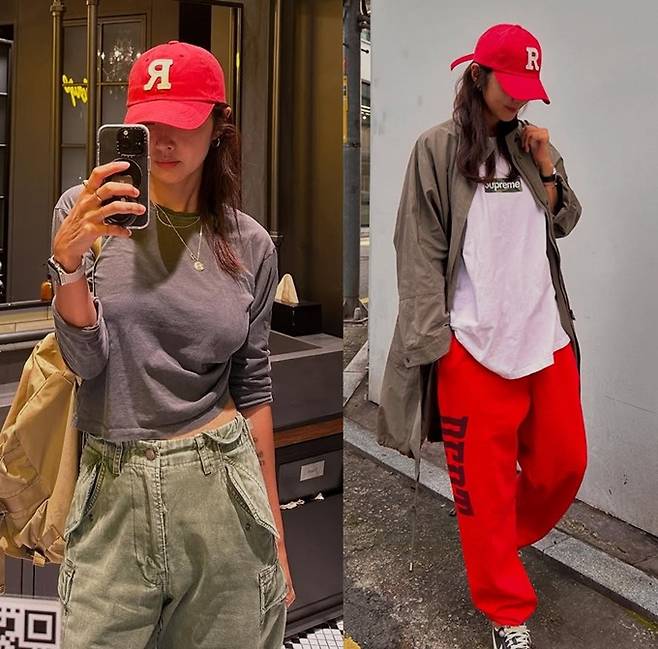 공개한 사진에서 김빈우는 카고 팬츠에 스웻셔츠, 빨간색 트랙 팬츠에 화이트 티셔츠, 데님 카고 팬츠에 스웻셔츠를 입고 색깔 별로 모자를 매치한 힙한 데일리룩으로 걸크러시한 스타일을 완성했다.