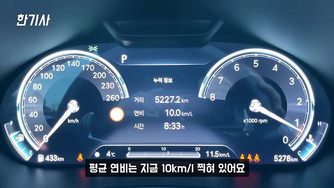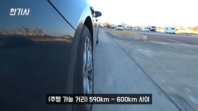 저는 주유할 때 가득은 안 넣고 5만 원씩 항상 넣는데 5만 원 넣으면 딱 반 차요. 그러면 주행가능거리가 590~600km 사이 떠요. 장거리를 많이 가서 그렇습니다. 하지만 단거리일 때는 연비가 1.8km/L 나온다. 거의 뭐 포르쉐 정도 타는 거죠.