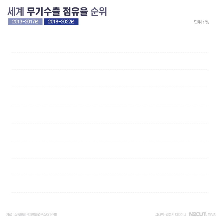 스웨덴 스톡홀름국제평화연구소(SIPRI)는 '2022년 국제 무기이전 동향' 보고서를 통해 대한민국이 2018~2022년 전 세계 방산수출 시장에서 2.4%의 점유율을 기록했다고 밝혔습니다. 이는 직전 5년(2013~2017년) 점유율보다 1.1%포인트 늘어난 수치입니다. 무기 수출 순위는 전년도 보고서(2017~2021년)보다 한 계단 내려온 9위에 위치하고 있습니다.
