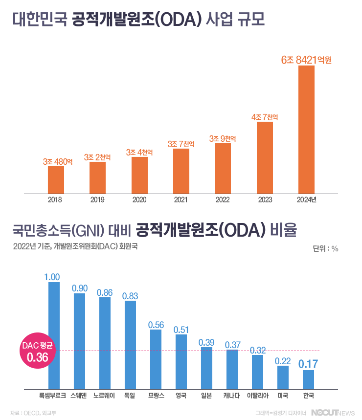 윤석열 정부의 '글로벌 중추 국가 전략'에 따른 것으로, 선진국형 ODA를 추진하겠다는 공약 이행을 위해 예산 규모를 대폭 확대했습니다. DAC 가입국들의 평균 GNI 대비 ODA 예산은 0.36%인데 우리나라는 0.17% 수준에 불과합니다.