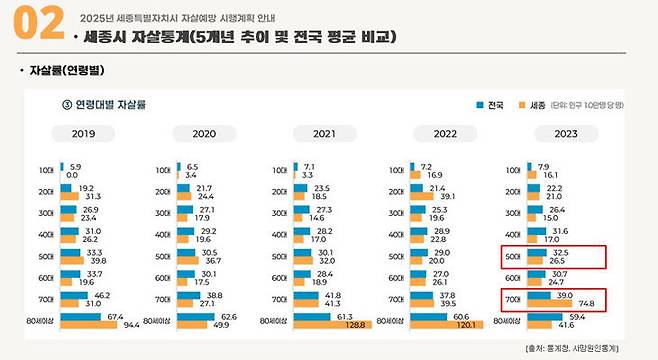 21일 세종시광역정신건강복지센터가 공개한 자살률 통계자료를 살펴보면 가장 최근 기록인 2023년도 기준 50대와 70대의 자살 증가세가 뚜렷한 가운데, 전년 대비 각 6.5명, 35.3명(인구 10만명 당) 증가했다.