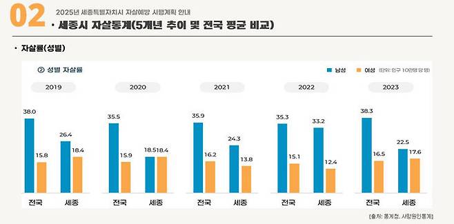 한편 세종시는 정부의 제5차 자살예방 기본계획(2023~2027)을 토대로 자살 예방 시행계획을 마련해 추진하고 있다. 시는 2025년 집중 관리대상으로 청소년(10대)와 중장년층, 초기 노년기, 자살 유족을 설정해 다양한 사업을 추진 중이다.