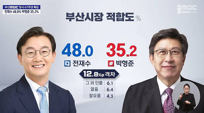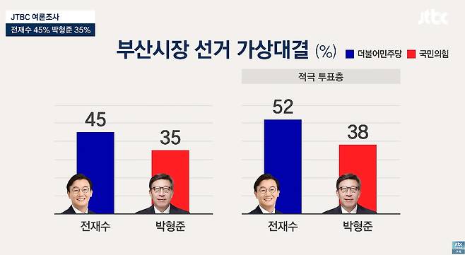 | ▲ 지난 4월 11일~12일 양일간 JTBC가 메타보이스와 글로벌리서치에 의뢰한 6.3 부산시장 선거 여론조사 결과(만18세 이상 803명 대상, 전화면접, 응답률 9.3%). 자세한 내용은 여론조사심의위 누리집 참조. |