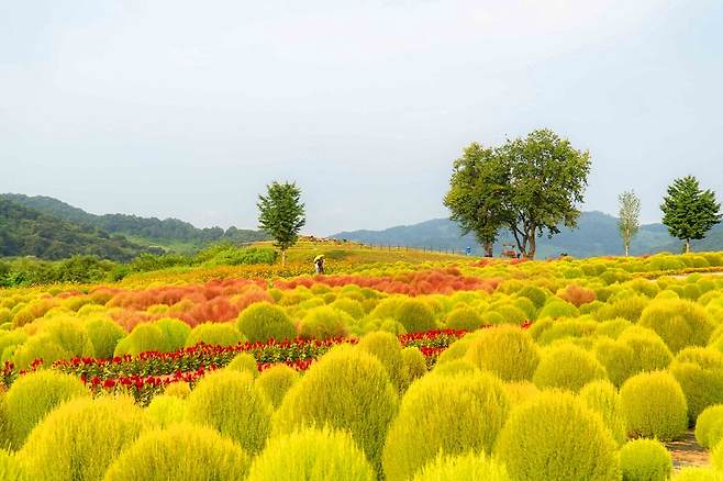 ‘겸허’, ‘청초한 미인’이라는 꽃말을 지닌 댑싸리는 봄부터 초여름까지 연둣빛 녹음을 품고, 8월 말부터 붉은빛이 돌며, 9월 초부터 주황색, 분홍색, 빨간색 등 알록달록한 색감으로 물들어갑니다.