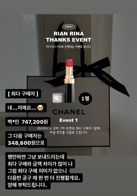 영숙은 공지를 통해 "최다 구매자, 네... 저예요. 747,200원. 그 다음 구매자는 348,600원. 왠만하면 그냥 보내드리는데 최다 구매와 금액 차이가 많이 나 그럼 최다 구매 의미가 없으니 다음번 공구 때 한번 더 진행할게요. 양해 부탁드립니다"라고 말했다.