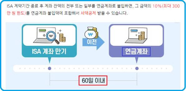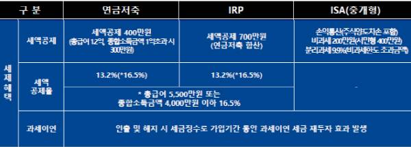 또한 연금계좌(연금저축/IRP)으로의 이전을 통해 연금자산 확보가 가능해진다는 장점이 있다. 예를 들어 ISA계좌에서 운용수익이 없더라도 1억 원을 연금계좌로 이전한다면 이전년도에 ISA에서 이전한 금액의 10% 한도로 300만원까지 추가 연금세액공제가 가능하고, 이전금액 1억 원 중 나머지 9700만원에 대해서는 연금계좌에 추가납입이 없더라도 이전년도 이후부터는 매년 세액공제(연금저축 400만/ IRP 700만)를 받을 수 있는 것이다.