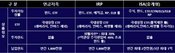 ISA는 연금계좌와 달리 주식, 인버스, 레버리지 ETF/ETN에 투자가 가능하기에 절세상품으로 공격적인 투자가 가능하다. 마지막으로 ISA는 만기 해지 후 가입자격이 된다면 재가입이 가능하기 때문에 다시 비과세한도(200~400만원)를 확보할 수 있다는 장점이 있다. 따라서 ISA는 지금 당장 필요하지 않더라도 일단 가입해 두는 것이 재테크 차원에서 현명한 선택으로 보인다. 다만 ISA의 비과세와 분리과세, 그리고 손익통산을 비롯한 다양한 혜택을 누리기 위해서는 3년 이상 계좌에 머물러 있어야 하는 기간적인 제한이 있음은 반드시 기억해야 할 것이다.