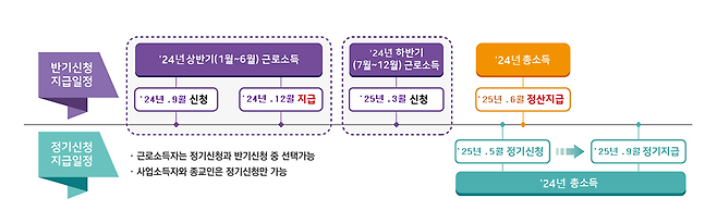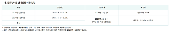 정기 신청은 근로·사업 등 모든 소득이 있는 가구를 대상으로 하며 매년 5월에 신청합니다. 2025년 정기 신청 기간은 5월 1일부터 6월 2일까지였고, 지급은 9월 말까지 이루어집니다. 반면, 반기 신청은 근로소득만 있는 가구가 반년 단위로 신청해 각각 12월과 다음 해 6월에 지급받는 구조입니다.