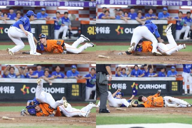 | ▲ 홈 수비 과정에서 한화 김인환과 충돌한 원태인 |