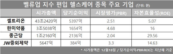벨류업지수는 정부가 국내 증시의 ‘코리아 디스카운트’ 해결 차원에서 기업가치 우수기업에 대한 시장평가와 투자유도를 위해 개발한 지수다. 구성 종목들은 시가총액과 거래대금 등 규모 요건 외에 수익성, 주주환원, 시장 평가 등 다양한 질적 요건을 충족하는 기업들로 구성됐다. 현재까지 총 105개의 기업이 산출됐으며 이 중 헬스케어 부문에는 JW중외제약을 포함해 셀트리온, 한미약품, 종근당 등 총 12개 회사가 편입됐다.