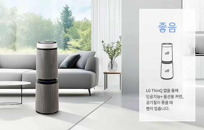 또한, 우리 집 공기질 데이터를 실시간으로 수집·분석하여 제공하는 공기질 리포트를 확인할 수 있으며, 전용 앱 LG ThinQ를 통해 현재 공기 청정도와 주요 오염원을 한눈에 파악할 수 있다.