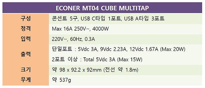 에코너 MT04 전선형 1.8M 큐브 멀티탭 4000W는 이름에서도 알 수 있듯이 250V 16A로 최대 합계 허용량 4000W의 고용량을 지원하는데, 안전을 위해 정격의 80%인 3200W 이내로 사용할 것을 권장하고 있다. 또한 단일 정격 2500W가 넘는 가전 기기는 사용 금지이다. 이처럼 고용량을 사용하기 위해 전선도 상당히 굵은 것을 채택했으며, 미사용 시 깔끔한 정리를 위해 벨트로 타이가 기본 제공된다.