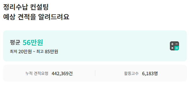 숨고 내에서 거래되는 정리수납 컨설 평균 비용은 건당 56만 원입니다. 최저 비용은 20만 원, 최고 비용은 85만 원으로 책정되어 있어요.