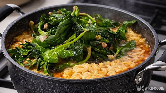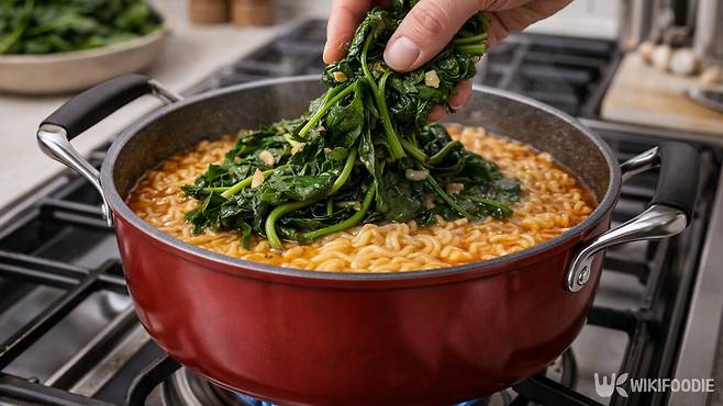 라면 조합에서 가장 큰 변화를 만드는 재료는 '시금치'다. 초록색 잎채소가 라면과 어울리지 않을 것 같지만, 실제로는 역할이 뚜렷하다. 시금치는 데치는 시간이 매우 짧고, 라면이 거의 완성된 뒤 한 줌 넣기만 하면 된다.